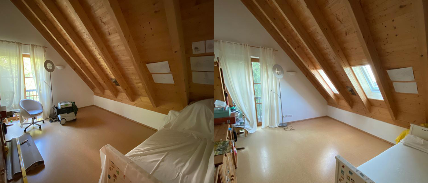 Eine Belichtungsmöglichkeit in dunklen Räumen ist der Einbau von Dachfenstern an passender Stelle. Der Lichteinfall wird durch die große Glasfläche der Dachfenster gefördert. Räume gewinnen so an Attraktivität und wirken beim Betreten von Grund auf angenehmer und anspruchsvoller. Hier zu sehen ist der klare Helligkeitsunterschied nach dem Einbau der Dachflächenfenster im Vergleich zur geschlossenen Variante.