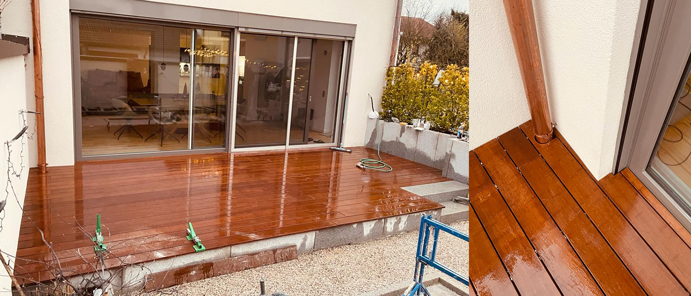 Für diese Terasse wurden Bretter aus Bambus verbaut. Bambus zählt botanisch nicht zu den Holzgewächsen, sondern ist ein verholztes Gras aus der Familie der Poaceae. Diesem Gras kann jedoch im Vergleich zum Holz in weiten Teilen Asiens, Südamerikas und Afrikas eine größere Bedeutung als Bau- und Werkstoff zugesprochen werden. Dieser Rohstoff gilt als sehr hart, schwer und massiv, sowie auch höchst witterungsbeständig. Optisch schaffen die Bambusdielen hier als wie auch in vielen anderen Fällen einen edlen Eindruck.