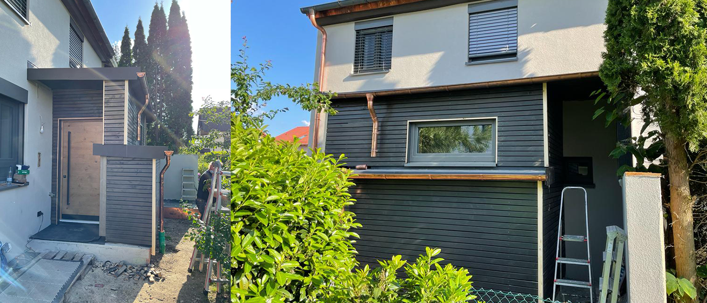 Für den Umbau eines Wohnhauses wurde ein separat angebauter Eingangsbereich benötigt. Um dieses Projekt durchführen zu können, musste zunächst eine Bodenplatte angefertigt werden und ein Durchbruch in der bestehenden Außenwand erstellt werden. Der Eingangsbereich wurde in Holzrahmenbauweise durchgeführt. Hierbei wurde Holzweichfaserdämmung zwischen den Tragbalken und als Auftragdämmung außerhalb der Konstruktion aufgebracht. Als Fassade wurden hier Parallelogrammleisten mit Voranstrich gewählt. Als wasserabweisende Unterschicht wurde eine diffusionsoffene Fassadenbahn verwendet, die eine Feuchtigkeitseindringung in die Konstruktion verhindert. Das Innenleben des Eingangsbereiches wurde zur Garderobe umstrukturiert. Hierzu mussten maßangefertigte Möbel hergestellt werden. Diese wurden von unserem Kollegen, Florian Voichtleitner, Möbel- und Montageschreiner, eindrucksvoll und sehr sauber erstellt. Das Ergebnis kann sich durchaus sehen lassen!