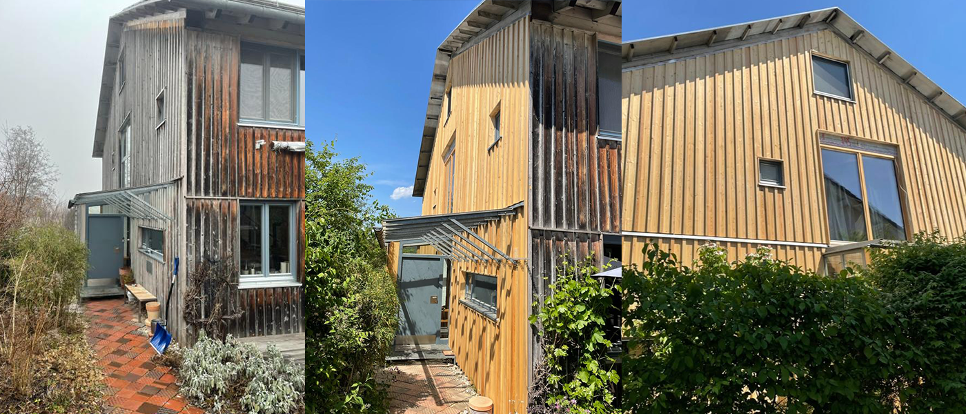 Eine Holzfassade, die entgegen der westlichen Himmelsrichtung angebracht ist, besitzt meist eine geringere Beständigkeitsdauer, als Fassaden, die an anderen Gebäudeseiten angebracht sind. Grund hierfür sind die Schlechtwetterereignisse, die in Deutschland meist über die westliche Himmelsrichtung entstehen. Hier hatte eine Fichtenholzfassade mit Anstrich ihre besten Tage hinter sich. Diese wurde durch hochwertige Lärchenhölzer ersetzt, wobei aufgrund der höheren Witterungsbeständigkeit kein zusätzlicher Anstrich unbedingt notwendig ist. Belasst man es bei einer natürlichen Ausführung von Lärchenholz, bekommt diese zwar im Laufe der Zeit einen grauen Farbton, hat allerdings keine große Auswirkung auf die Beständigkeit des Holzes selbst. Zusätzlich wurde im Treppenhausbereich ein bodentiefes Fensterelement durch die Schreinerei Bartl eingebaut, um einen höheren Lichteinfall im Gangbereich zu schaffen. Aufgrund der optischen Merkmale im Außenbereich wurde das Fensterelement ebenfalls in Lärchenholz verbaut.