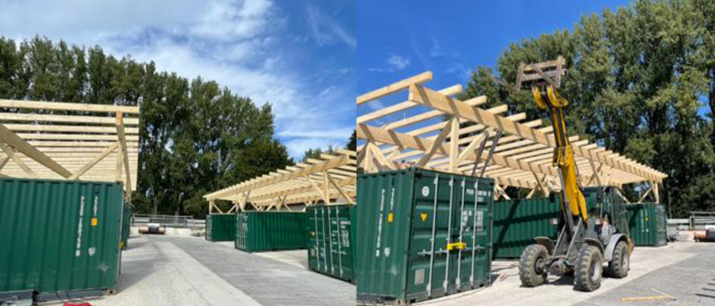 Für dieses Projekt war eine Idee von einem oder mehreren Unterständen der Anfang. Die Schiffscontainer wurden zunächst in ein umgebautes Fahrsilo gestellt. Die Staufläche in den Containern dienen in diesem Fall als Aufbewahrungslager. Über den Containern wurde ein Dachtragwerk mit einer späteren Trapezblecheindeckung erstellt. Der dadurch gewonnene überdachte Raum zwischen den Containern kann somit umgenutzt werden. In diesem Fall wird der Platz als Hackschnitzellager für eine Heizversorgung verwendet.
