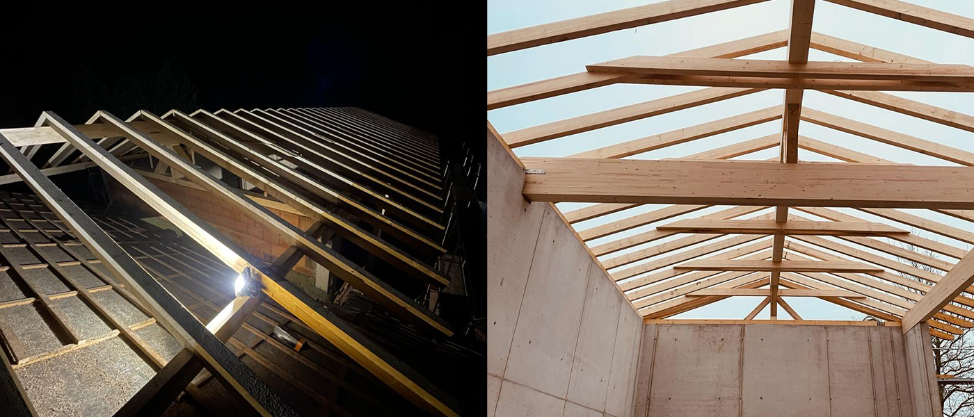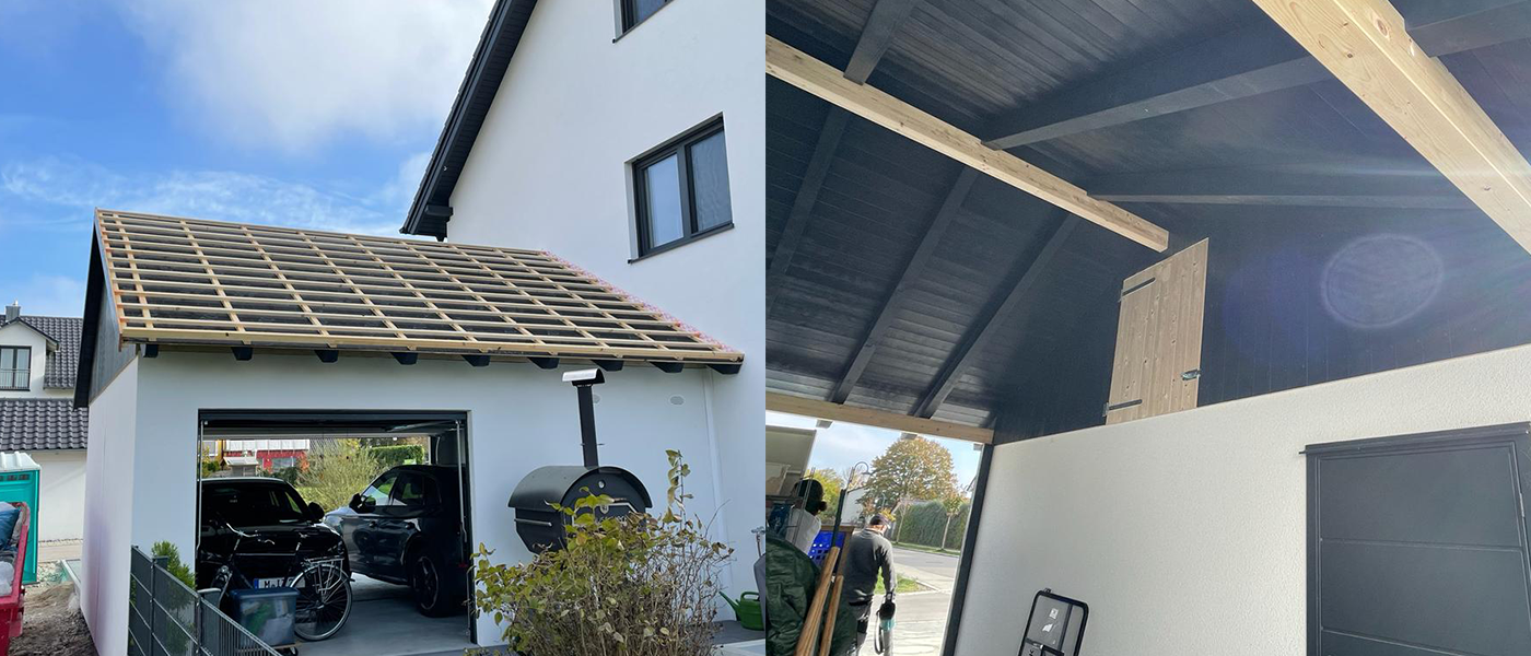 Bei vorangefertigten Garagenmodulen wird, wie es auch hier der Fall war, meist nur ein Flachdach aus Stahlbeton verbaut. Aus baurechtlichen Gründen wurde allerdings von der zuständigen Bauaufsichtsbehörde ein Satteldach gefordert, welches sich in Farbe und Neigung an das Hauptgebäude anpasst und somit den Anforderungen des Bebauungsplanes gerecht wird. An einer der beiden Garagen ist ein sichtbarer Unterstand erstellt worden. Als optisches Schmankerl wurde hier ein Sprengwerk zur Lastabtragung verbaut.