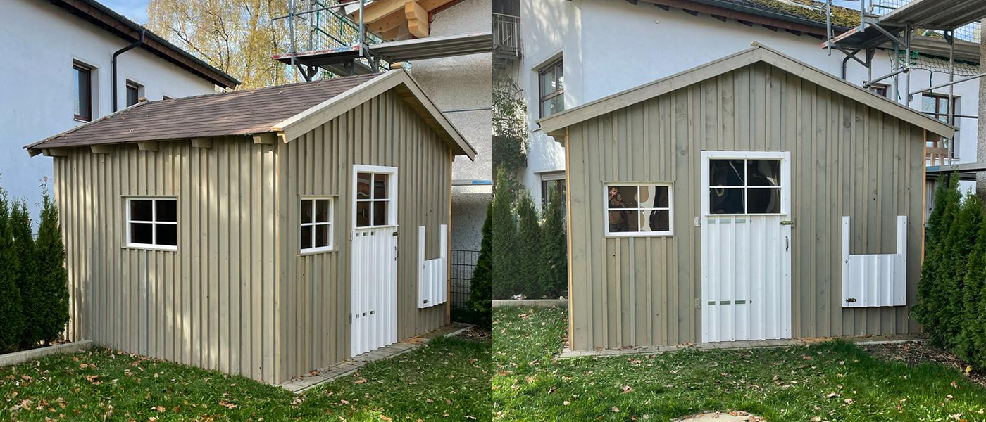Auf Wunsch wurde ein Gartenhäuschen mit einer Boden-Leisten-Fassade als Anlehnung an den schwedischen Baustil erstellt. Als wasserabweisende Schicht wurden Bitumendachschindeln aufgetragen. Zusätzlich wurde ein Hasenstall mit Schiebetür integriert.